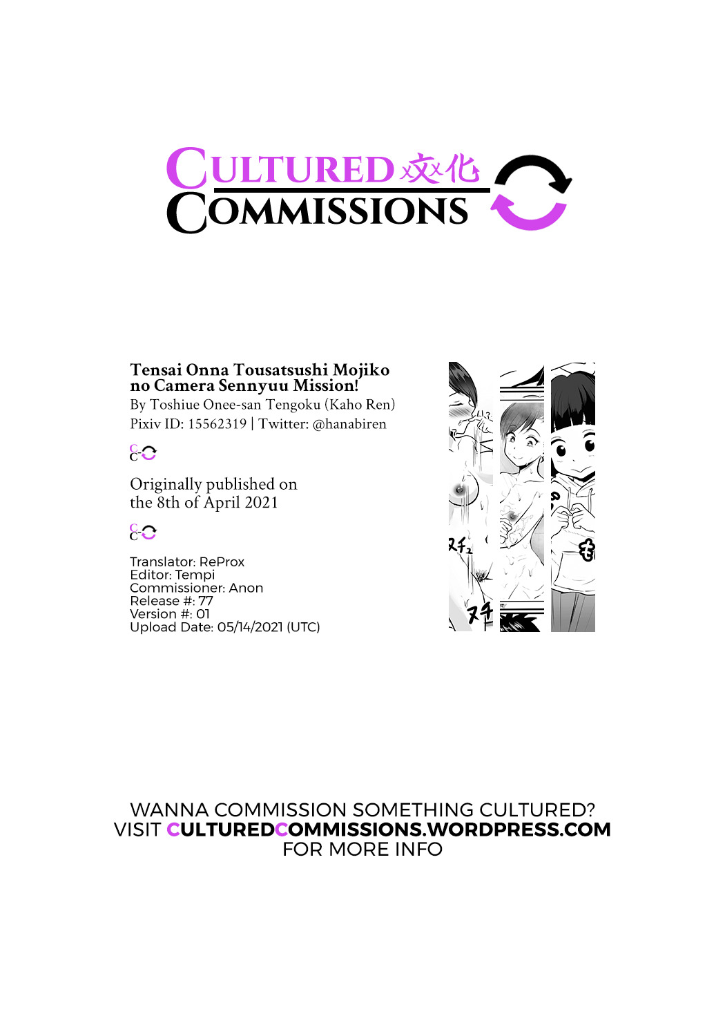 [Toshiue Onee-san Tengoku (Kaho Ren)] Tensai Onna Tousatsushi Mojiko no Camera Sennyuu Mission! | Mojiko The Genius Voyeur Camerawoman's Infiltration Mission! [English] [CulturedCommissions]