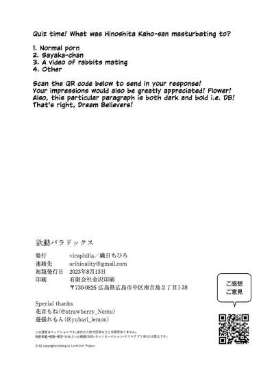 (C102) [virophilia (Orihi Chihiro)] Yokudou Paradox - LES PULSIONS ET LES PARADOXES. | Drive and Paradox (Love Live! Hasunosora Jogakuin School Idol Club) [English]