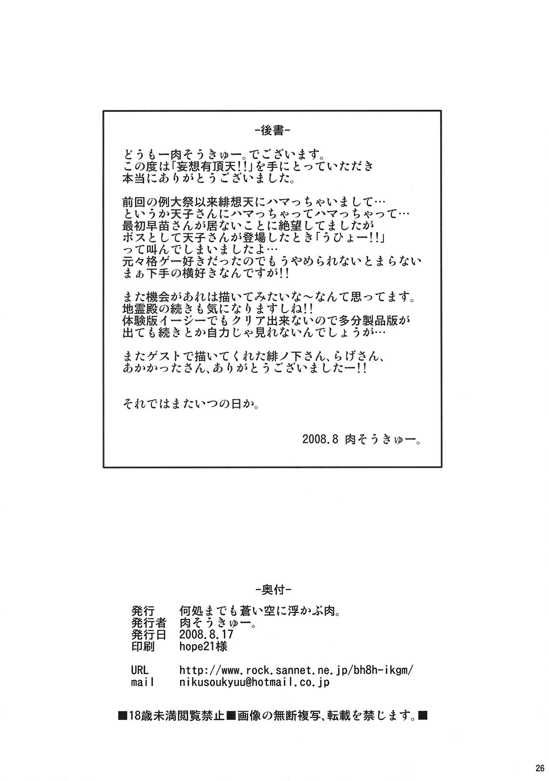 (C74) [Dokomademo Aoi Sora ni Ukabu Niku (Nikusoukyuu)] Mousou Uchouten!! (Touhou Project)