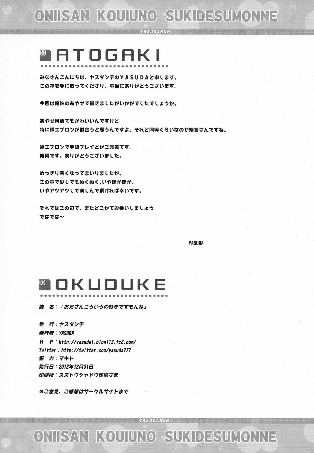 (C83) [YASUDANCHI (YASUDA)] Onii-san Kou Iu no Suki Desu Mon ne (Ore no Imouto ga Konna ni Kawaii Wake ga Nai)